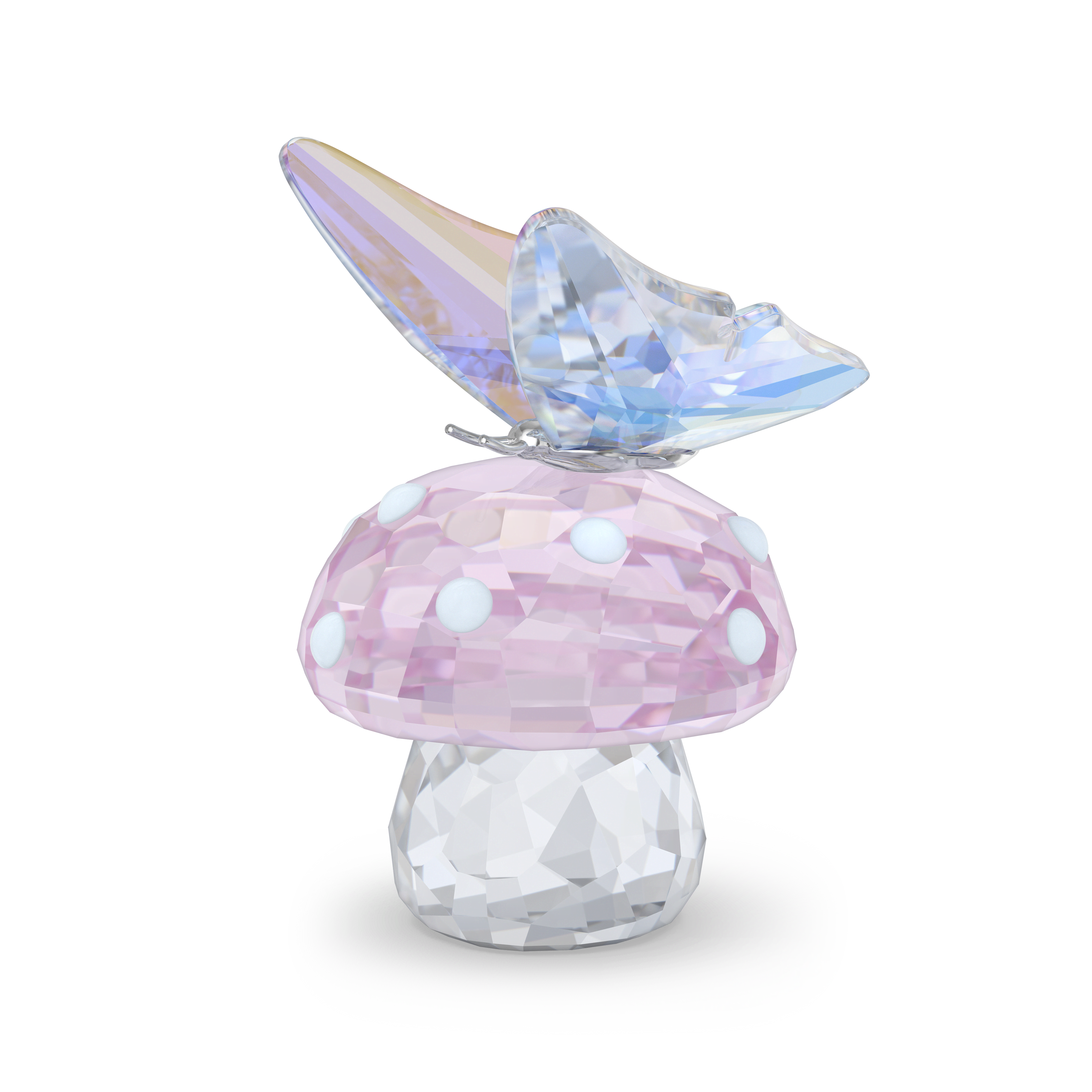 Captured in a sweet moment from nature, this decoration piece showcases the glorious wings of the butterfly in the Aurore Boreale effect landing on playful pink and white mushroom.