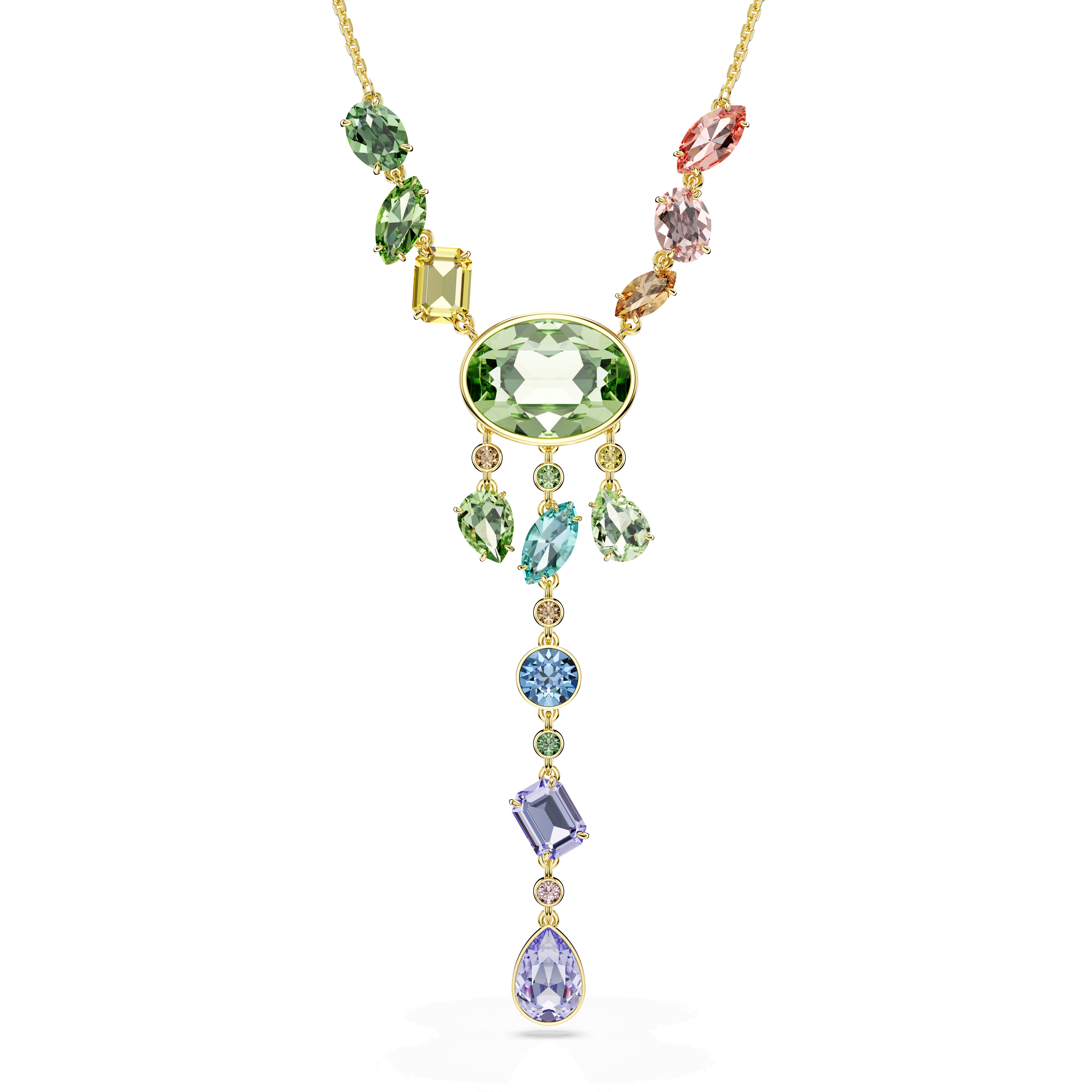 Brought to life with a cascade of saturated colours, this 18k gold finish necklace is made to impress.